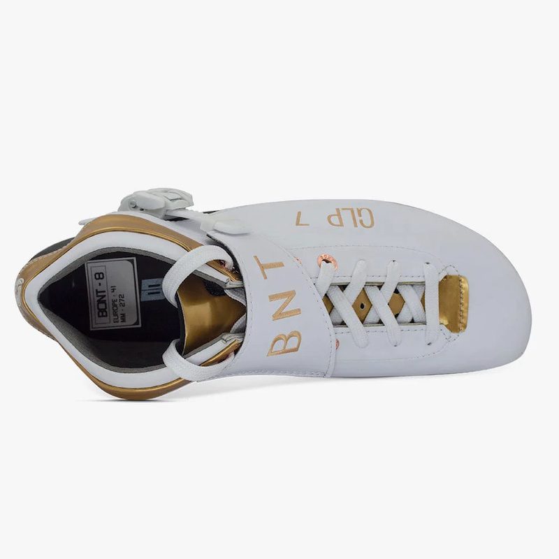 The boot uses a white matte Durolite outer skin with shiny gold accents. It has BNT embroidered on the lace cover and GLP 7 on the side of the boot with the Bont circle logo on the rear.