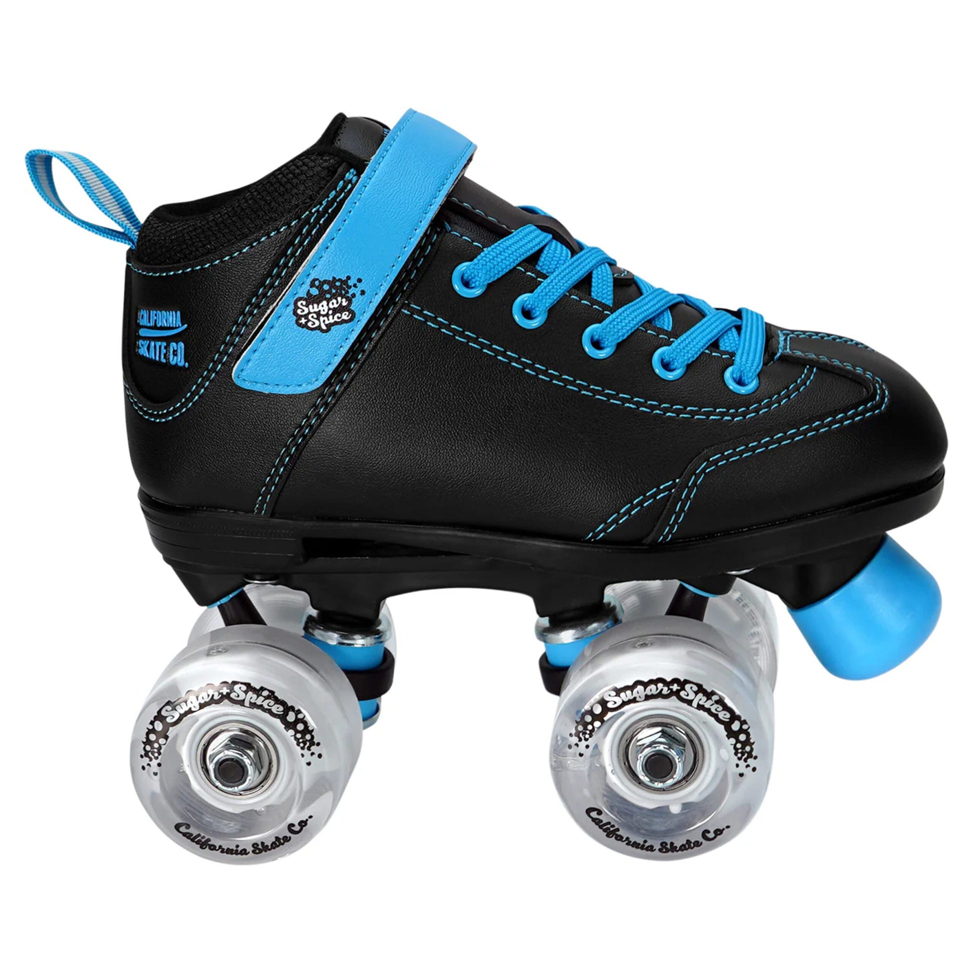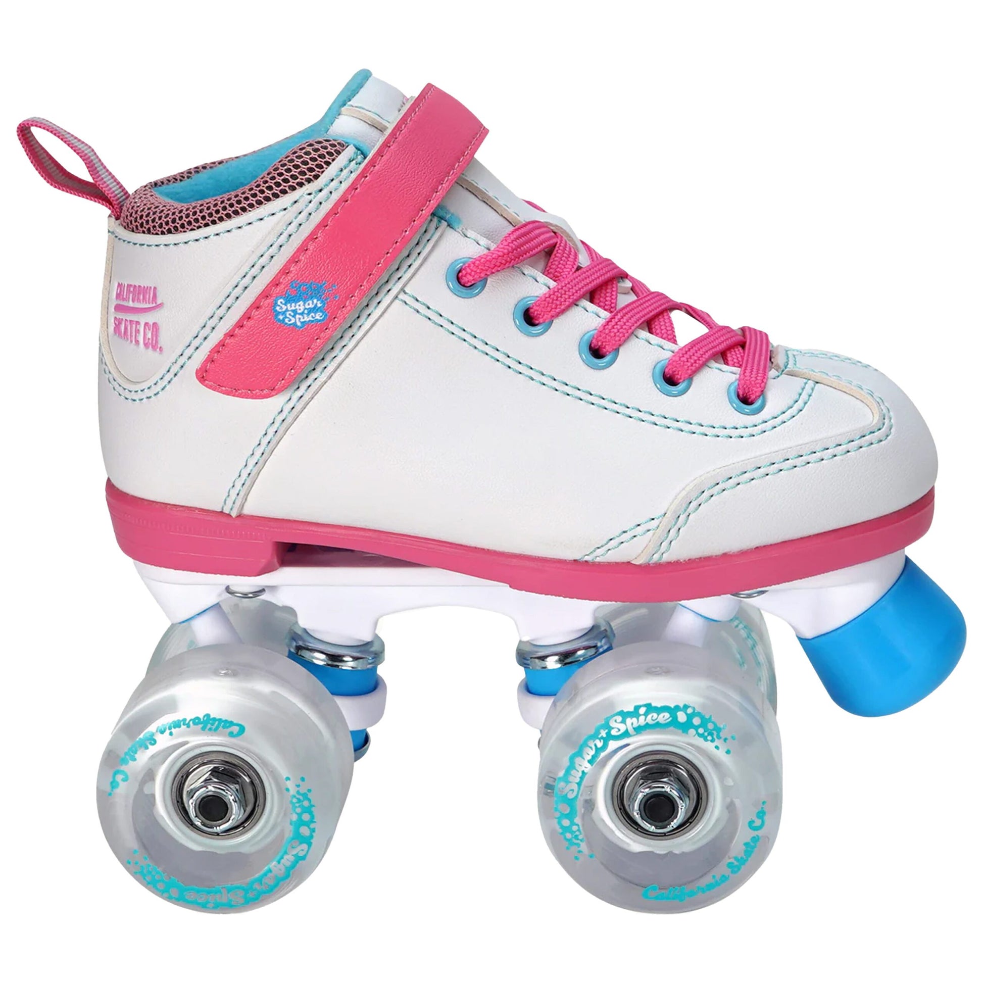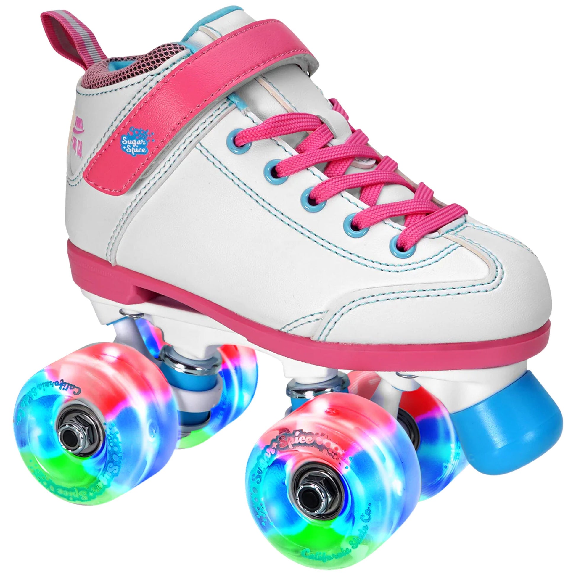 Sure-grip's newest Sugar & Spice junior skate. An amazingly comfortable junior skate featuring a vinyl boot with exceptional padding. A lightweight nylon plate and nylon trucks, perfect for beginner skating. Full Urethane cushions and light-up indoor / outdoor wheels. A fixed toe stop that can be replaced. Junior sizes only.