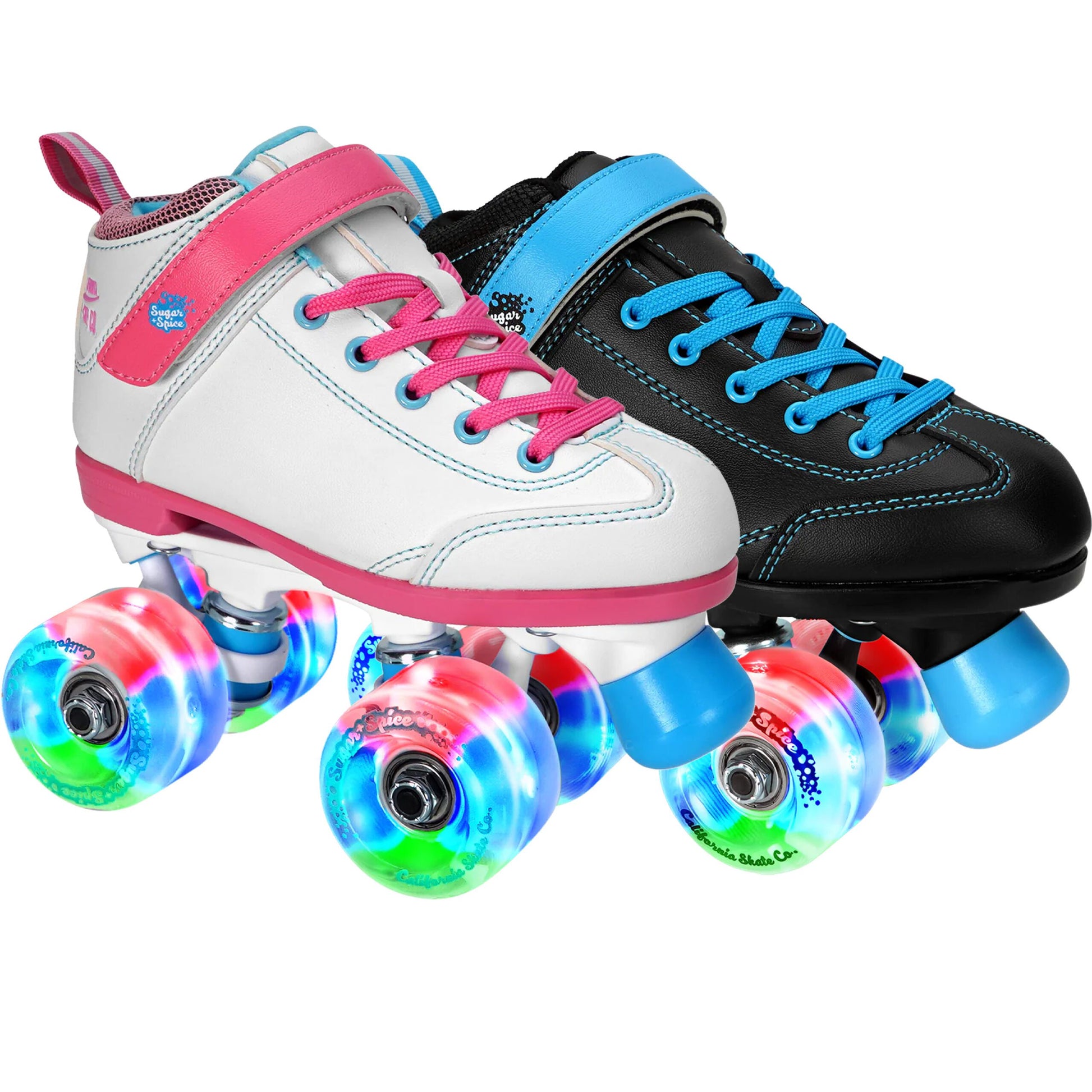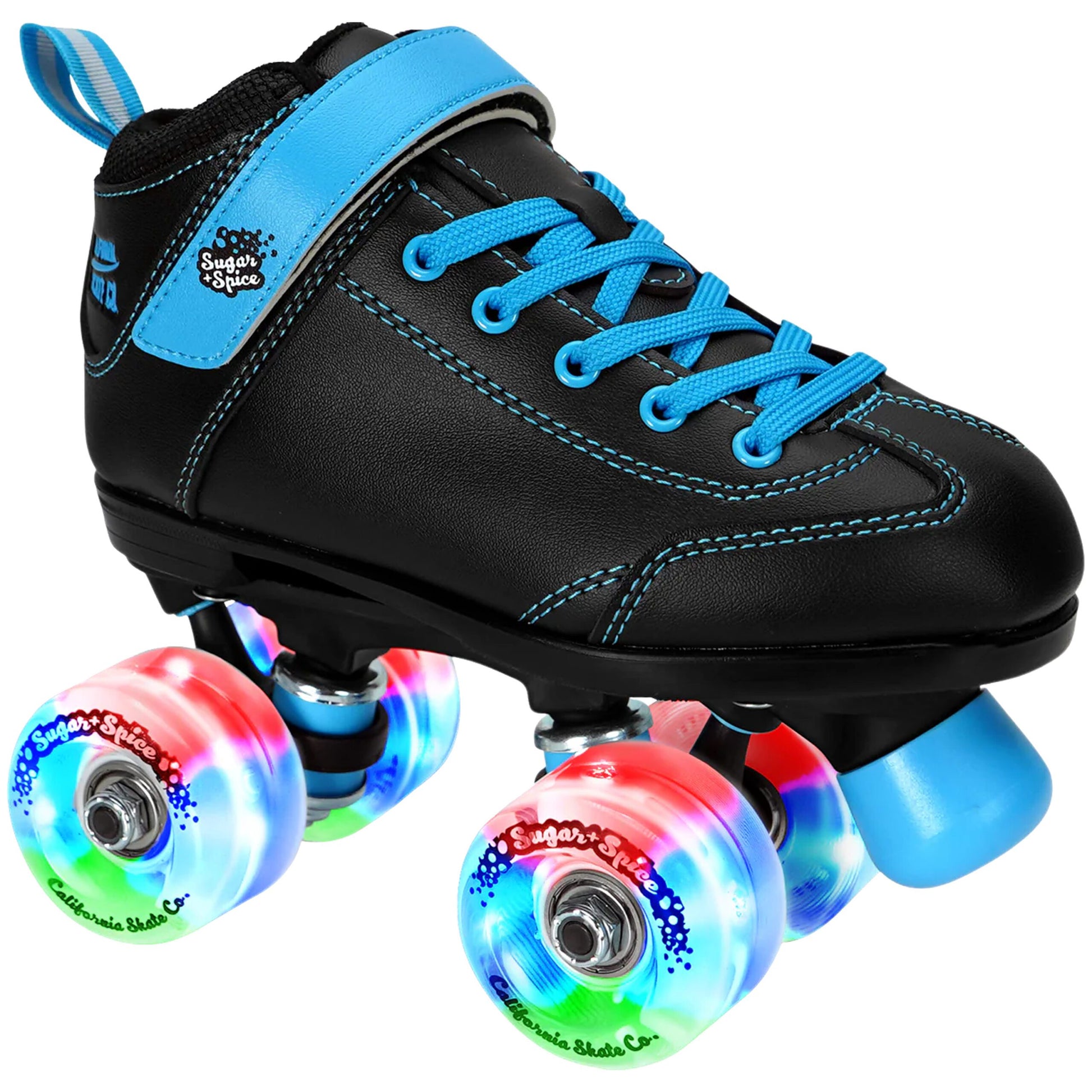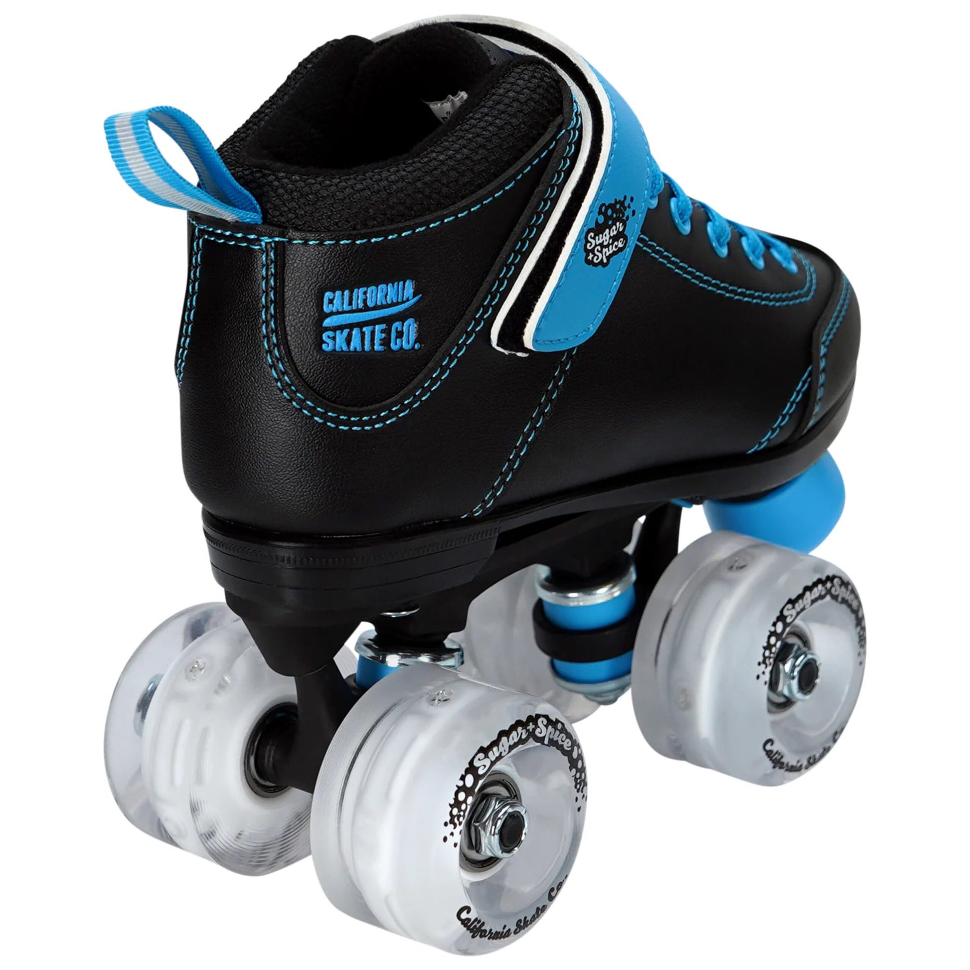 Sure-grip's newest Sugar & Spice junior skate. An amazingly comfortable junior skate featuring a vinyl boot with exceptional padding. A lightweight nylon plate and nylon trucks, perfect for beginner skating. Full Urethane cushions and light-up indoor / outdoor wheels. A fixed toe stop that can be replaced. Junior sizes only.