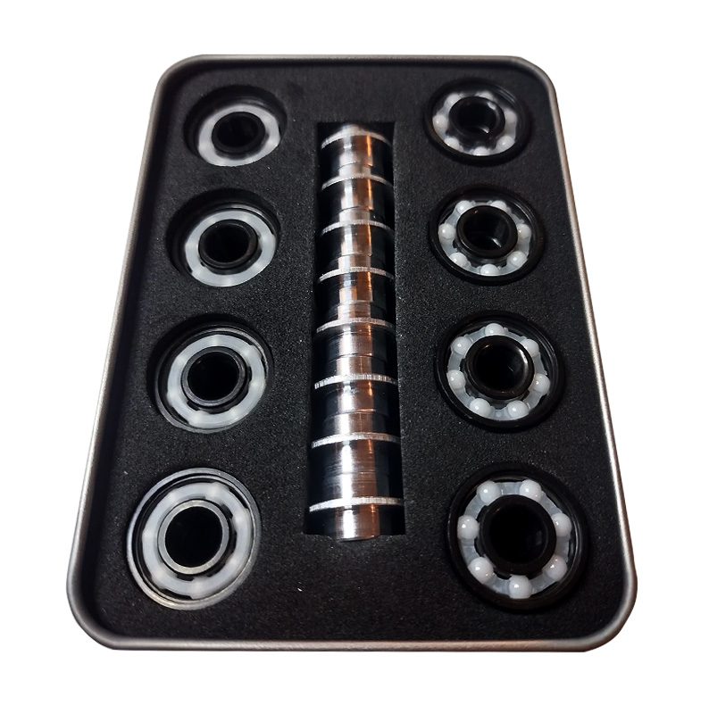Tornado's stage 1 hybrid bearings. Made of high-quality steel with oxidized races and white ceramic balls to create less friction and drag with better roll than all steel bearings.